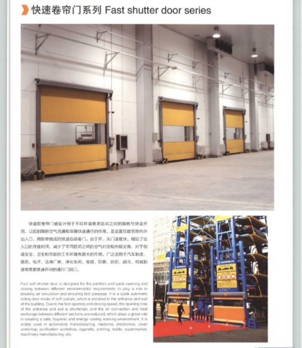 快速门又称为快速卷帘门、高速门、高速卷帘门,是通过PLC、变频器、编码器控制(PVC材质)门帘快速升降,是专为物料的快速流动(以缩短进出时间)而设计的。快速门具有快速、安全、可靠等特点,快速门快速门主要功能是保温、保湿、防尘、防虫、隔音等,使车间保持恒温、恒湿、洁净的工作环境。适用于食品、医药、电子、橡胶、化工、汽车、纺织、物流等领域。