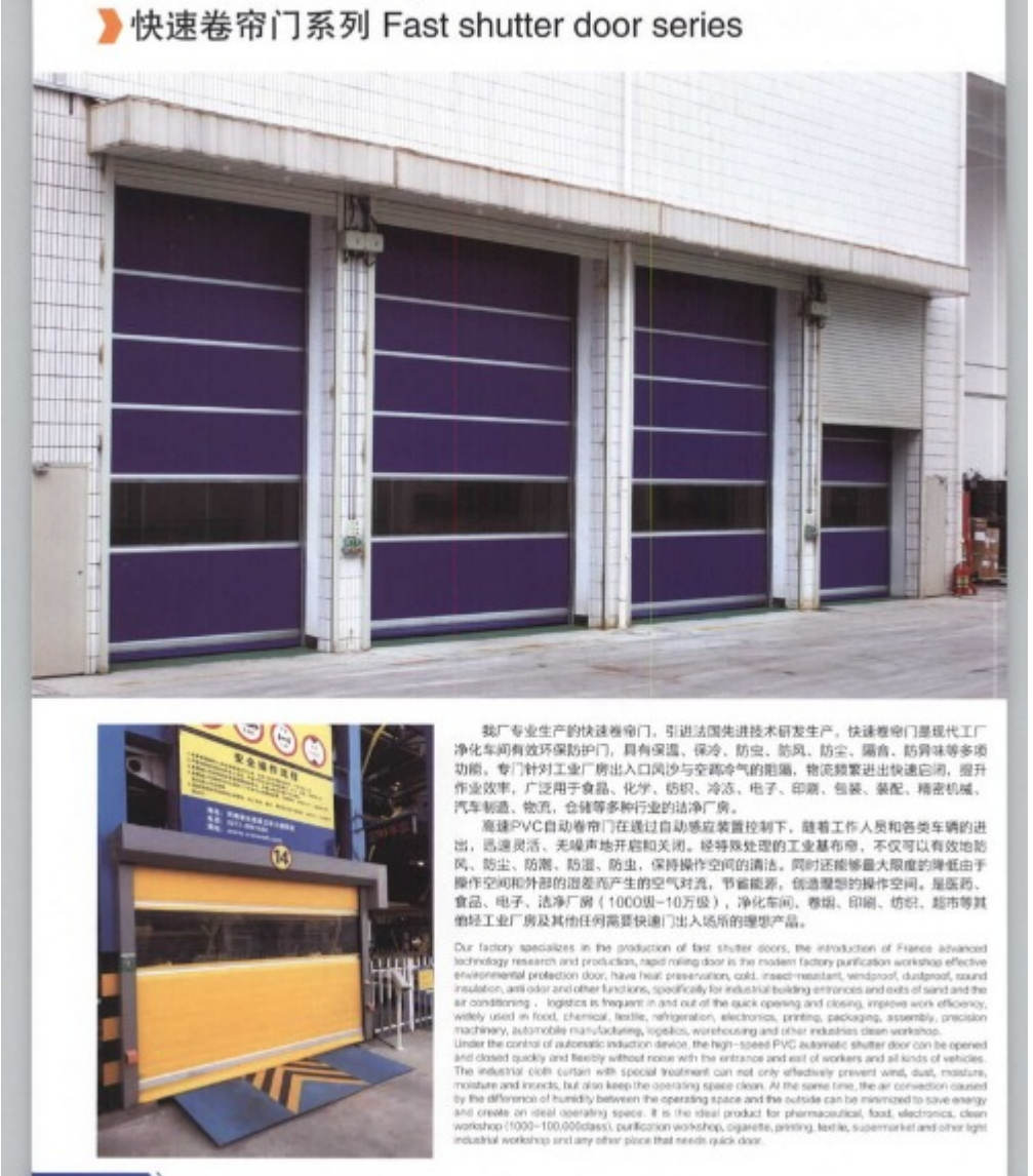 快速门又称为快速卷帘门、高速门、高速卷帘门,是通过PLC、变频器、编码器控制(PVC材质)门帘快速升降,是专为物料的快速流动(以缩短进出时间)而设计的。